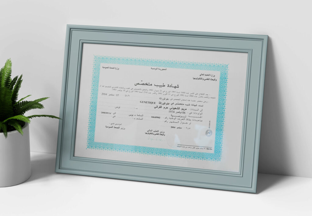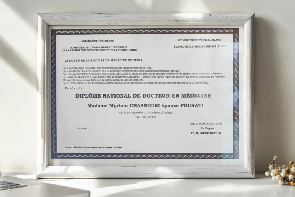 - Diplôme de doctorat en Médecine à la faculté de médecine de Tunis