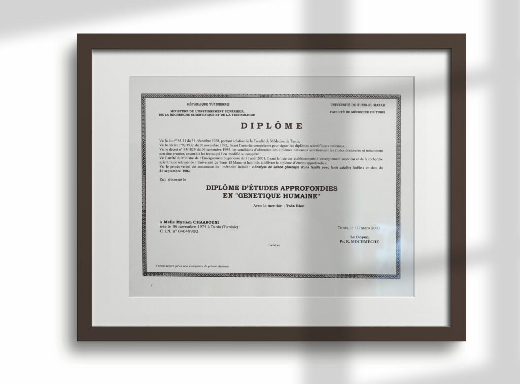 - Diplôme d’études approfondies de Génétique Humaine à la faculté de médecine de Tunis